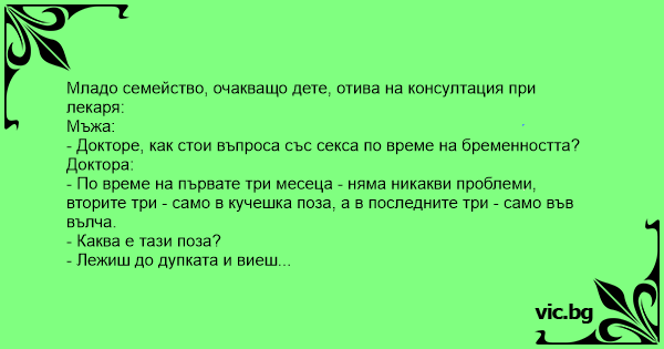 - Doktor úr, a feleségem terhes lett, ezért szeretném megkérdezni, hogy ezentúl hogyan csináljuk a szexet? - Hát kedves uram, az első hónapokban csinálhatják teljesen normálisan, majd a terhesség...