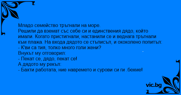 Решили да вземат със себе си и единствения дядо, който имали. Когато пристигнали, настанили се и веднага тръгнали към плажа. На входа дядото се стъписъл, и ококолено попитъл: