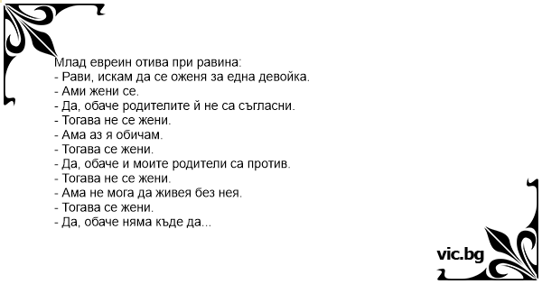 - Тогава не се жени. Знаеш ли, какъв съвет още мога да ти дам? Вземи, че се покръсти.