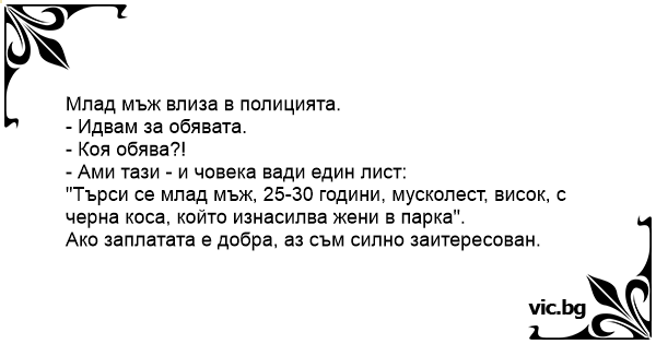 "Търси се млад мъж, 25-30 години, мусколест, висок, с черна коса, който изнасилва жени в парка".