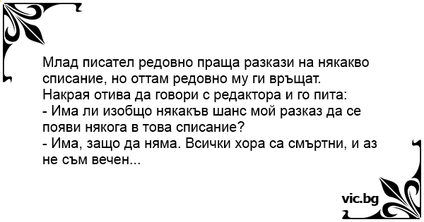 Млад писател редовно праща разкази на някакво списание, но оттам редовно му ги връщат.