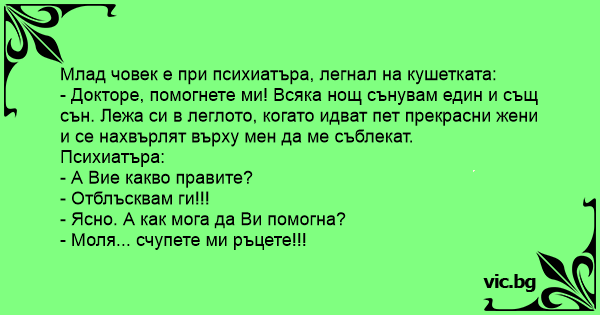 - Докторе, помогнете ми! Всяка нощ сънувам един и същ сън. Лежа си в леглото, когато идват пет прекрасни жени и се нахвърлят върху мен да ме съблекат.