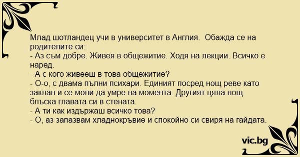 Ένας Σκοτσέζος, πάει να συνεχίσει τις σπουδές του σε ένα πανεπιστήμιο Στο Λονδίνο. Μετά το πρώτο εξάμηνο, δέχεται την επίσκεψη της μητέρας του. - Πως βρίσκεις τους Αγγλους συμφοιτητές σου, παιδί...
