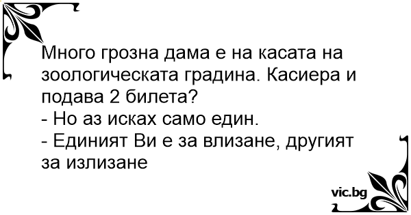 Много грозна дама е на касата на зоологическата градина. Касиера и подава 2 билета?
