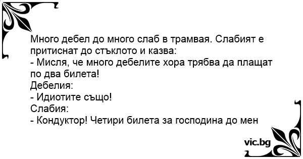 Много дебел до много слаб в трамвая. Слабият е притиснат до стъклото и казва: