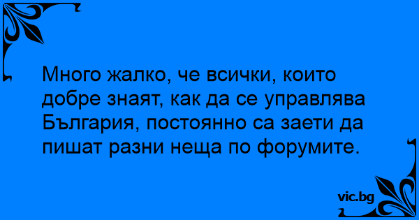 Много жалко, че всички, които добре знаят, как да се управлява България, постоянно са заети да пишат разни неща по форумите.<br />