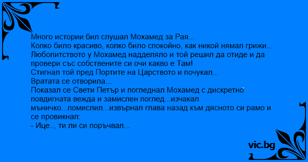 Показал се Свети Петър и погледнал Мохамед с дискретно повдигната вежда и замислен поглед...изчакал мъничко...помислил...извърнал глава назад към дясното си рамо и се провикнал: