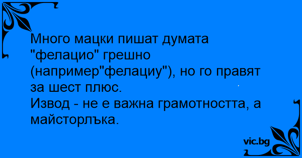 Много мацки пишат думата "фелацио" грешно (например"фелациу"), но го правят за шест плюс.
