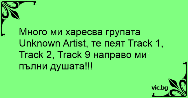 Много ми харесва групата Unknown Artist, те пеят Track 1, Track 2, Track 9 направо ми пълни душата!!!