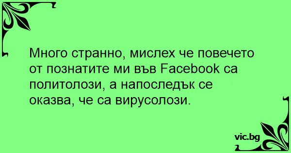 Много странно, мислех че повечето от познатите ми във Facebook са политолози, а напоследък се оказва, че са вирусолози.
