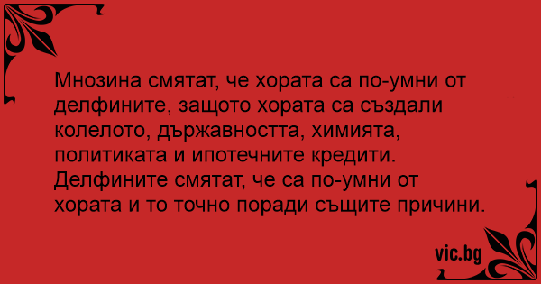 Мнозина смятат, че хората са по-умни от делфините, защото хората са създали колелото, държавността, химията, политиката и ипотечните кредити.