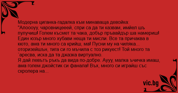 "Алоооуу, чаровницееей, спри са да ти казвам, имйел шъ пулучиш! Голем късмет та чака, добър пръвайдър ша намериш! Един юзър много хубави неща ти мисли. Все та причаква в кюто, ама ти много са крийш, ма! Пусни му на чиляка... оторизейшън, тига си го мъчила с тоз рикуест! Той много та `аресва, иска да та джазка виртуално.