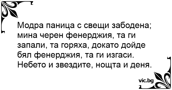 Модра паница с свещи забодена; мина черен фенерджия, та ги запали, та горяха, докато дойде бял фенерджия, та ги изгаси.