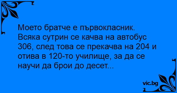 Моето братче е първокласник. Всяка сутрин се качва на автобус 306, след това се прекачва на 204 и отива в 120-то училище, за да се научи да брои до десет...