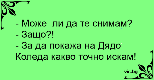 - Госпожице, може ли една ваша снимка? - Защо ви е? - Искам да покажа на дядо Коледа какъв подарък искам! - Можна тебе сфоткати, щоб я міг показати Дідові Морозу, який подарунок я хочу на Новий рік? ..