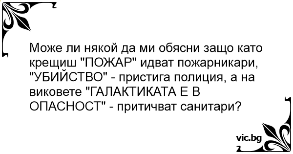 Може ли някой да ми обясни защо като крещиш "ПОЖАР" идват пожарникари, "УБИЙСТВО" - пристига полиция, а на виковете "ГАЛАКТИКАТА Е В ОПАСНОСТ" - притичват санитари?