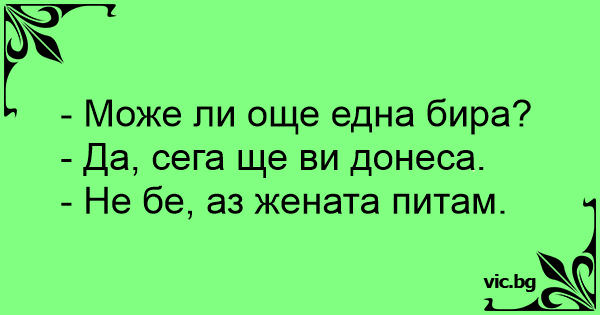 - Ќе може ли уште едно пиво? - Веднаш господине. - Не бе дечко, жената ја прашувам?