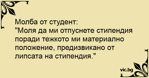 "Моля да ми отпуснете стипендия поради тежкото ми материално положение, предизвикано от липсата на стипендия."