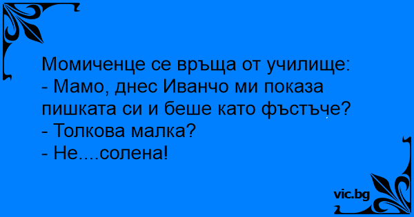 - Мамо, днес Иванчо ми показа пишkata си и беше като фъстъче?