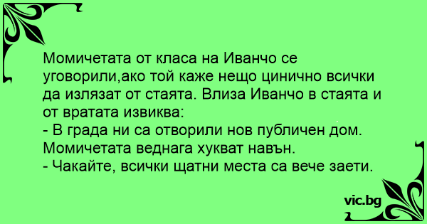 Момичетата от целия клас се уговорят, ако Иванчо каже нещо неприлично, те всички да станат и да си излязат.