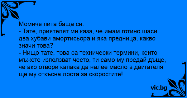 - Нищо тате, това са технически термини, които мъжете използват често, ти само му предай дъще, че ако отвори капака да налее масло в двигателя ще му откъсна лоста за скоростите!