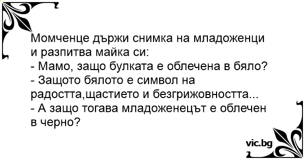 W kościele za chwilę ma się odbyć ślub. Młoda para zbliża się powoli do ołtarza. Wśród zebranych gości jest mała dziewczynka, która pyta mamę: - A dlaczego panna młoda jest tak ślicznie ubrana w... Lilla Elsa är på bröllop för första gången i sitt liv och frågar sin mamma varför bruden är klädd i vitt. - Jo, förstår du lilla Elsa, det är för att det är den lyckligaste dagen i hennes liv. Elsa... Una bambina alla madre nel giorno di un matrimonio: "Mamma perchè la sposa ha il vestito bianco?" E la mamma: "Perchè questo è un giorno felice e importante!" E la bambina: "E perchè lo sposo è... - Mamico, de ce poarta miresele rochii albe? - Fiindca exprima bucuria. - Atunci, mirele de ce-i imbracat in negru? Estaba una señora con su hijito de cinco años en la boda de su sobrina cuando el niño levanta la cabeza y le pregunta: Mami, mami, ¿Por qué la novia esta vestida toda de blanco? A lo que la mamá le... Anne küçük kızına anlatıyordu. "Bak kızım, gelinler en mutlu günleri olduğu için nikahta beyaz giyerler." Küçük kız bir an düşündü. "Yaa... Şimdi damatların neden siyah giydiklerini daha iyi... A családi fényképalbumban Móricka a szülei esküvői képet nézegeti. - Anyu, miért voltál fehér ruhában? - Azért, mert a fehér az öröm és a boldogság színe. - Akkor már értem, hogy az apu miért van... Juhani oli äidin kanssa häissä. Vihkiseremonian jälkeen hän kysyi: Äiti, miksi tädillä on valkea mekko? Koska hän on niin iloinen tänään, äiti vastasi. Juhani mietiskeli hetken ja kysyi sitten:... A little boy, at a wedding looks at his mom and says, “Mommy, why does the girl wear white?” His mom replies, “The bride is in white because she’s happy and this is the happiest day of her life.”... Öğretmen derste şunları anlatıyordu: - Düğünlerde gelinler neden beyaz giyer bilir misiniz? Bu onların en mutlu günü olduğu için! Arka sıralardan bir ses yükselir; - Damatların neden siyah elbise... No meio de uma cerimônia de casamento, Joãozinho pergunta: — Mamãe! Por que toda noiva se veste de branco? — Porque é o dia mais feliz da vida dela! — responde a mãe. — Entendi... E por que o noivo... Toto passe devant une église avec sa maman, voyant sortir des jeunes mariés, il demande : - Maman, pourquoi la mariée est-elle en blanc ? - Parce que c'est le plus beau jour de sa vie ! - Et le monsieur alors, pourquoi est-il en noir ? Na ślubie Jaś pyta się taty: - Tato, dlaczego ta pani jest ubrana na biało? - Bo jest szczęśliwa, synku. - Tatusiu, a dlaczego ten pan jest ubrany na czarno? El niño Bernardino asiste a su primera boda – Al cabo de un rato, le pregunta a su mama: – Mamá, mamá, ¿por qué la novia va vestida de blanco? – Pues… porque este es el día más feliz de su vida. – Ah… y dime, ¿porque el novio va vestido de negro? Una bimba assiste per la prima volta a un matrimonio: a un certo punto chiede alla madre: A little boy looks at his mum at a wedding and says, “Mummy, why is the girl dressed all in white?” Защо в деня на сватбата булката е облечена в бяло? Απορίες ενός μικρού κοριτσιού Το νυφικό Wedding Dress Мамо, мамо, а зошто… Мамо, ги гледав сликите од вашата свадба со тато и сакам да те прашам зошто носиш бел фустан? Мајката: Зошто белата боја е боја на радоста. Детето: А тогаш зошто тато е во црно?! - Mor? Hvorfor har bruden en hvit kjole på? Moren: - Fordi hvitt symboliserer lykke, og bryllupsdagen er den lykkeligste dagen i hennes liv. Piken: - Jammen, hvorfor har brudgommen da sort på? - Mamo, dlaczego na zdjęciu ślubnym jesteś w białym welonie?- zapytał Jasiu. - Biały kolor to znak radości, synku. - A dlaczego tata jest ubrany na czarno? Un enfant et sa mère passent devant une église. Un mariage s'y passe. L'enfant demande à sa mère: - Maman, pourquoi la mariée est habillée en blanc ? - Car le blanc symbolise la joie et c'est le... - Mamá, ¿por qué las mujeres se visten de blanco en las bodas? - Porque es el día más feliz de su vida. - Ah, ya se porque los hombres se visten de negro. 1 mère et 1 fils parle: Fils: Maman pourquoi la mariée porte une robe blanche le jour du mariage? Mère: Car c'est le plus beau jour de sa vie. Fils: Alors pourquoi le marié est habillé en noir? Toto et ses parents assistent à un mariage. Toto demande à sa maman : - Pourquoi la mariée à une robe blanche ? - Car c’est le jour le plus magnifique de sa vie, répond sa mère. - Alors pourquoi le... *boy whispers to his mom during a wedding* Boy: "Mommy?" Mom: "What?" Boy: "Why is the girl dressed in white?" Mom: "Because this is the happiest day of her life." Boy: "... so why is the boy... Attending a wedding for the first time, a little girl whispered to her mother, "why is the bride dressed in white?" "Because white is the color of happiness," her mother explained. "And today is... Mergaičiukė pirmą kartą vestuvėse: - Mama, o kodėl šita…jaunoji… visa baltai apsirengusi? - Todėl, kad šiandien pati džiugiausia diena jos gyvenime. Po pauzės: - Mama, o kodėl jaunasis apsirengęs...