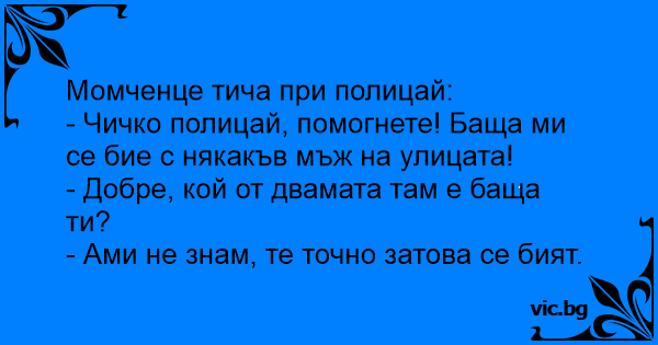 - Чичко полицай, помогнете! Баща ми се бие с някакъв мъж на улицата!