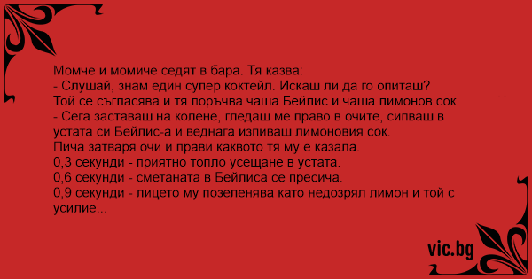 - Сега заставаш на колене, гледаш ме право в очите, сипваш в устата си Бейлис-а и веднага изпиваш лимоновия сок.