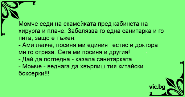 Момче седи на скамейката пред кабинета на хирурга и плаче. Забелязва го една санитарка и го пита, защо е тъжен.