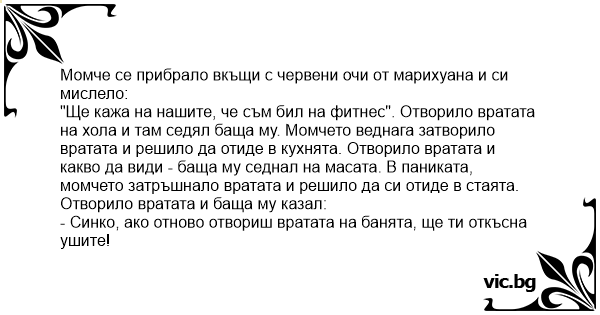"Ще кажа на нашите, че съм бил на фитнес". Отворило вратата на хола и там седял баща му. Момчето веднага затворило вратата и решило да отиде в кухнята. Отворило вратата и какво да види - баща му седнал на масата. В паниката, момчето затръшнало вратата и решило да си отиде в стаята. Отворило вратата и баща му казал: