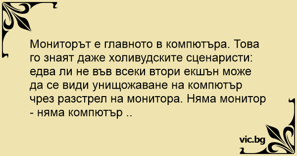 Мониторът е главното в компютъра. Това го знаят даже холивудските сценаристи: едва ли не във всеки втори екшън може да се види унищожаване на компютър чрез разстрел на монитора. Няма монитор - няма компютър ..