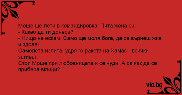 Моше ще лети в командировка. Пита жена си: