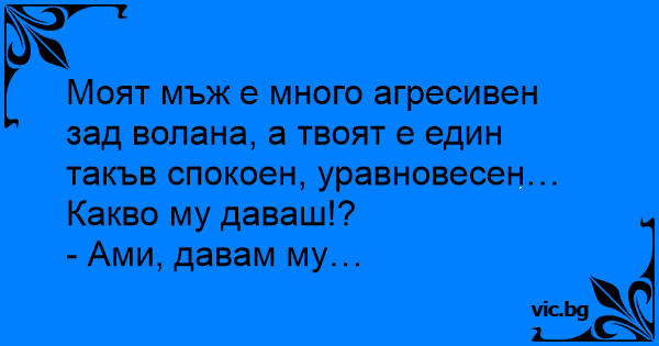 Моят мъж е много агресивен зад волана, а твоят е един такъв спокоен, уравновесен… Какво му даваш!?