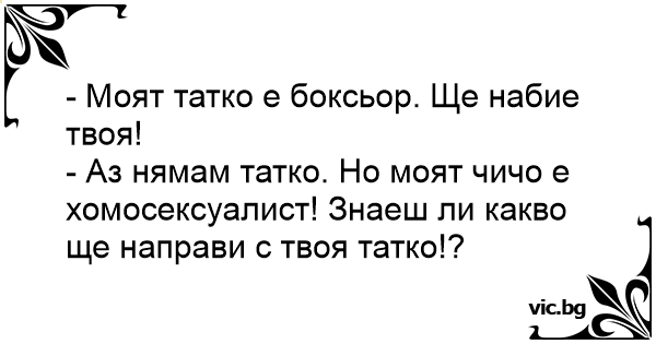 - Аз нямам татко. Но моят чичо е хомосексуалист! Знаеш ли какво ще направи с твоя татко!?