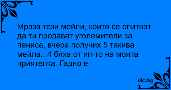 Мразя тези мейли, които се опитват да ти продават уголемители за пeниca, вчера получих 5 такива мейла...4 бяха от ип-то на моята приятелка. Гадно е.