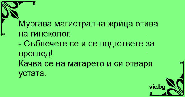 Мургава магистрална жрица отива на гинеколог.