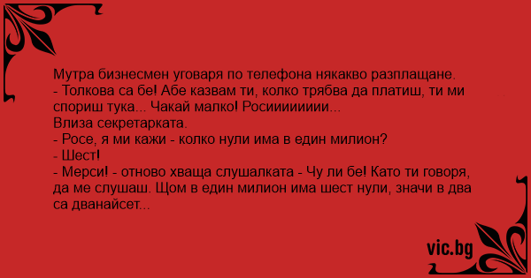- Мерси! - отново хваща слушалката - Чу ли бе! Като ти говоря, да ме слушаш. Щом в един милион има шест нули, значи в два са дванайсет...
