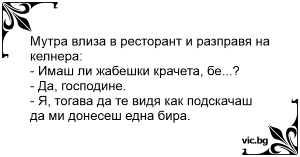 La un restaurant, un client Intreaba ospatarul: - Ai picioare de Broasca? - Nu, asa merg eu mai cracanat. Altceva?