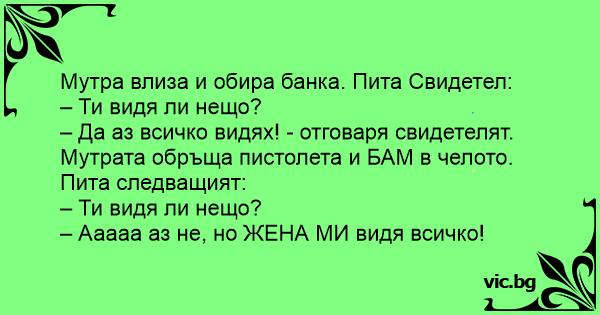 Είδες τίποτε; A robber robs a bank, gets all the money and is about to leave, but before that he asks a customer who’s lying on the floor, “Have you seen me rob this bank?” Бандит ограбва банка и взима заложници. Пита първия: A bank robber wanted to keep his identity secret, but didn't wear a balaclava. He told all in the bank not to look at him or he would shoot them. One foolhardy customer sneaked a look, and the robber promtply shot him. The robber asked if anyone else had seen his face. One customer, gazing... Kommt ein Mann mit einer Waffe in die Bank und kassiert alles Bargeld. Den daneben stehenden Mann fragt er: "Haben Sie gesehen, dass ich die Bank ausgeraubt habe?" "Ja, ich habe es gesehen." Der Bankräuber erschiesst den Mann. Zum nächsten Mann: "Haben Sie gesehen, dass ich die Bank ausgeraubt... Um perigoso ladrão entra armado em um banco. Assustando os clientes, vai até o atendente e exige todo o dinheiro do caixa. Com a quantia em mão, ele se volta para um dos clientes e pergunta: — Você me viu roubar esse banco? Com a voz trêmula, ele responde: — Sim, eu vi. Sem pensar duas vezes o... A masked man walks into a bank and holds it up at gunpoint to rob the bank. In the process of robbing the bank, his mask fell off. He quickly put it back on his face and asked the teller directly... Bandyta wchodzi do banku, kradnie pieniądze z kasy po czym podchodzi do jednego z klientów i pyta: - Widziałeś co zrobiłem? - Tak i mam zamiar zadzwonić na policję. Złodziej przyłożył mu pistolet... A man with a gun goes into a bank and demands for money. Once he is given the money, he turns to a customer and asks, “Did you see me rob this bank?” The man replied, “Yes sir, I did.” The robber... Un rapinatore, durante una rapina in banca, ha un'inconveniente: Gli scivola la maschera per qualche secondo. Subito provvede a coprirsi di nuovo, ma poco dopo, nel dubbio, chiede ad un cliente: -...