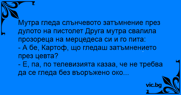 - А бе, Картоф, що гледаш затъмнението през цевта?