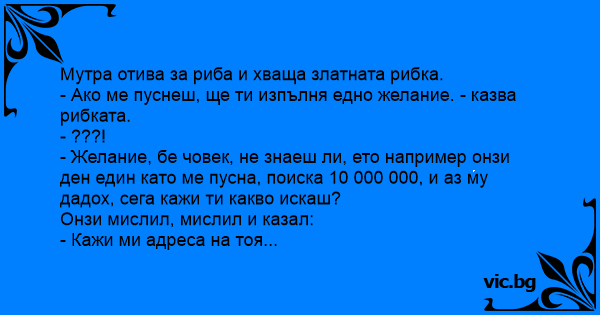 - Желание, бе човек, не знаеш ли, ето например онзи ден един като ме пусна, поиска 10 000 000, и аз му дадох, сега кажи ти какво искаш?