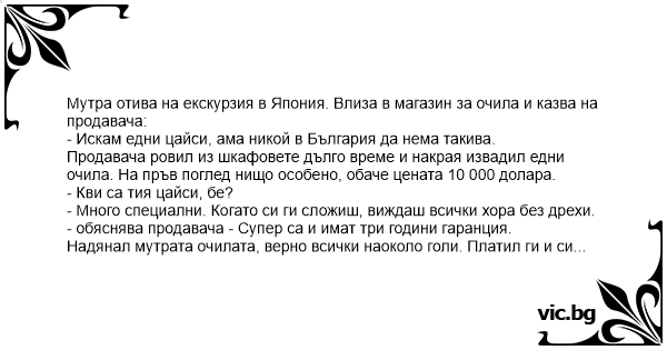 Сваля очилата - всички облечени. Така се занимавал през целия път. Кацнал в София и бързо се прибира вкъщи. Слага очилата и влиза в спалнята. Гледа - на леглото жена му с някакъв мъж. И двамата голи. Сваля очилата - пак жена му с някакъв мъж голи. Пак ги слага, сваля ги - все едно и също. Сваля очилата и ги тресва в земята: