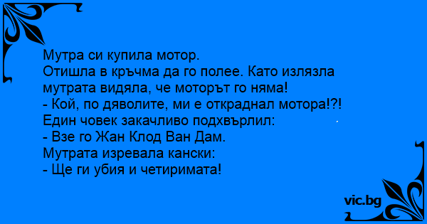 Отишла в кръчма да го полее. Като излязла мутрата видяла, че моторът го няма!