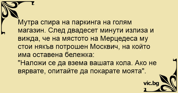 Мутра спира на паркинга на голям магазин. След двадесет минути излиза и вижда, че на мястото на Мерцедеса му стои някъв потрошен Москвич, на който има оставена бележка: