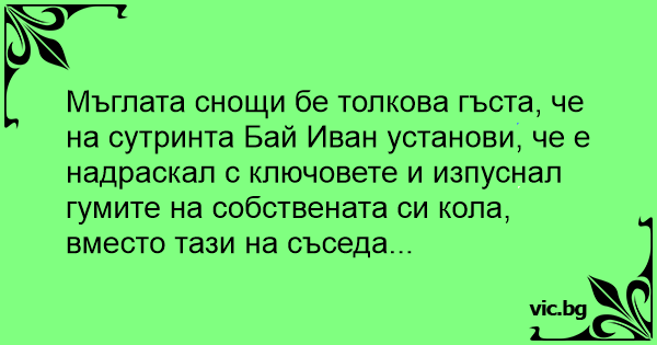 Мъглата снощи бе толкова гъста, че на сутринта Бай Иван установи, че е надраскал с ключовете и изпуснал гумите на собствената си кола, вместо тази на съседа...