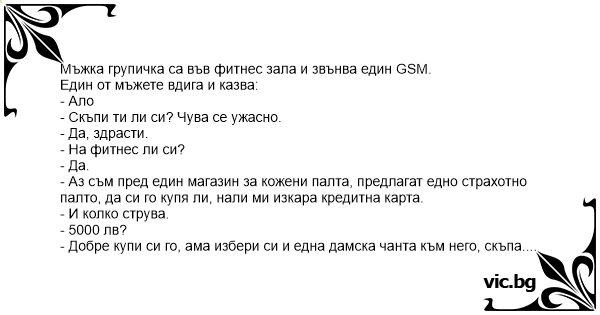 Мажи вежбаат во бодибилдинг клуб и ѕвони еден мобилен телефон. Еден од мажите се јавува и вели: - Ало. - Драги ти ли си? - Да, кажи. - Вежбаш ли? - Да. - Јас сум во една продавница за кожни палта....