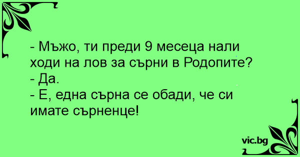 - Мъжо, ти преди 9 месеца нали ходи на лов за сърни в Родопите?
