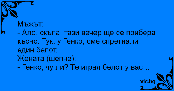 - Ало, скъпа, тази вечер ще се прибера късно. Тук, у Генко, сме спретнали един белот.