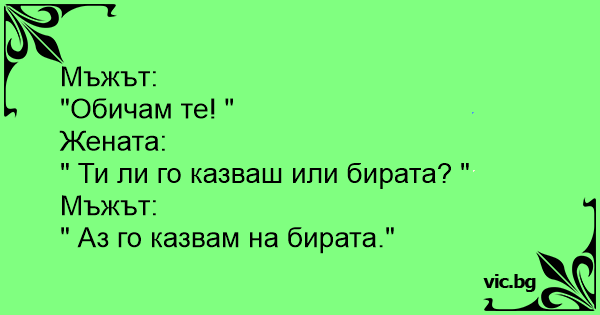 Седят си мъж и жена му на верандата и се наслаждават на прекрасен залез... Мъжът тихо прошепва: - Обичам те.... Жена му саркастично го пита... - Ти ли говориш или бирата..? Мъжа отговаря.. - Аз говоря ... на бирата.....