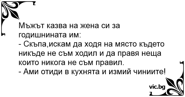 - Скъпа,искам да ходя на място където никъде не съм ходил и да правя неща които никога не съм правил.